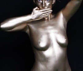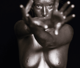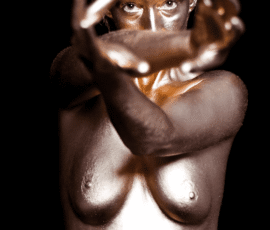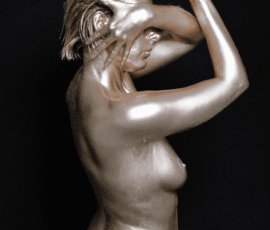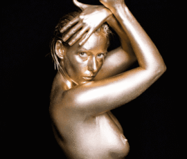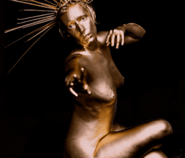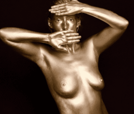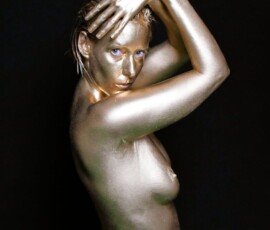 This image features a gold-painted nude woman with outstretched hands against a dark background, showcasing artistic body painting and creative photography techniques.