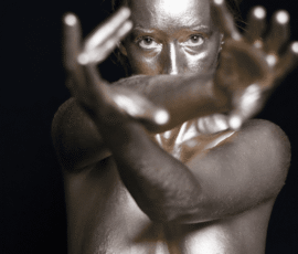 A woman covered in reflective gold body paint, reaching out with her hands and gazing intensely at the camera, against a dark background.