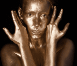 A striking artistic photograph of a nude woman with metallic gold body paint, posing creatively with hands framing her face against black backdrop.