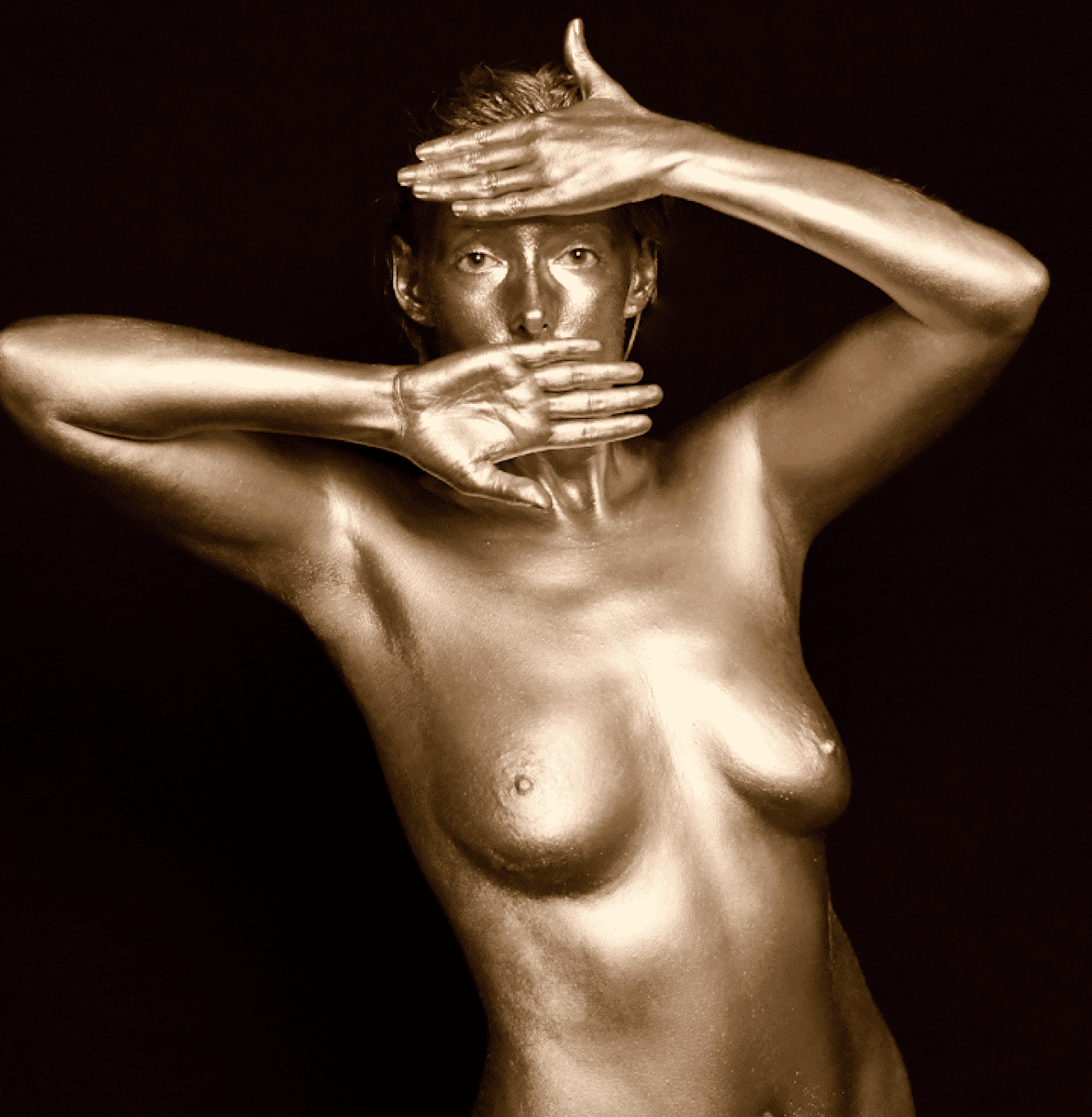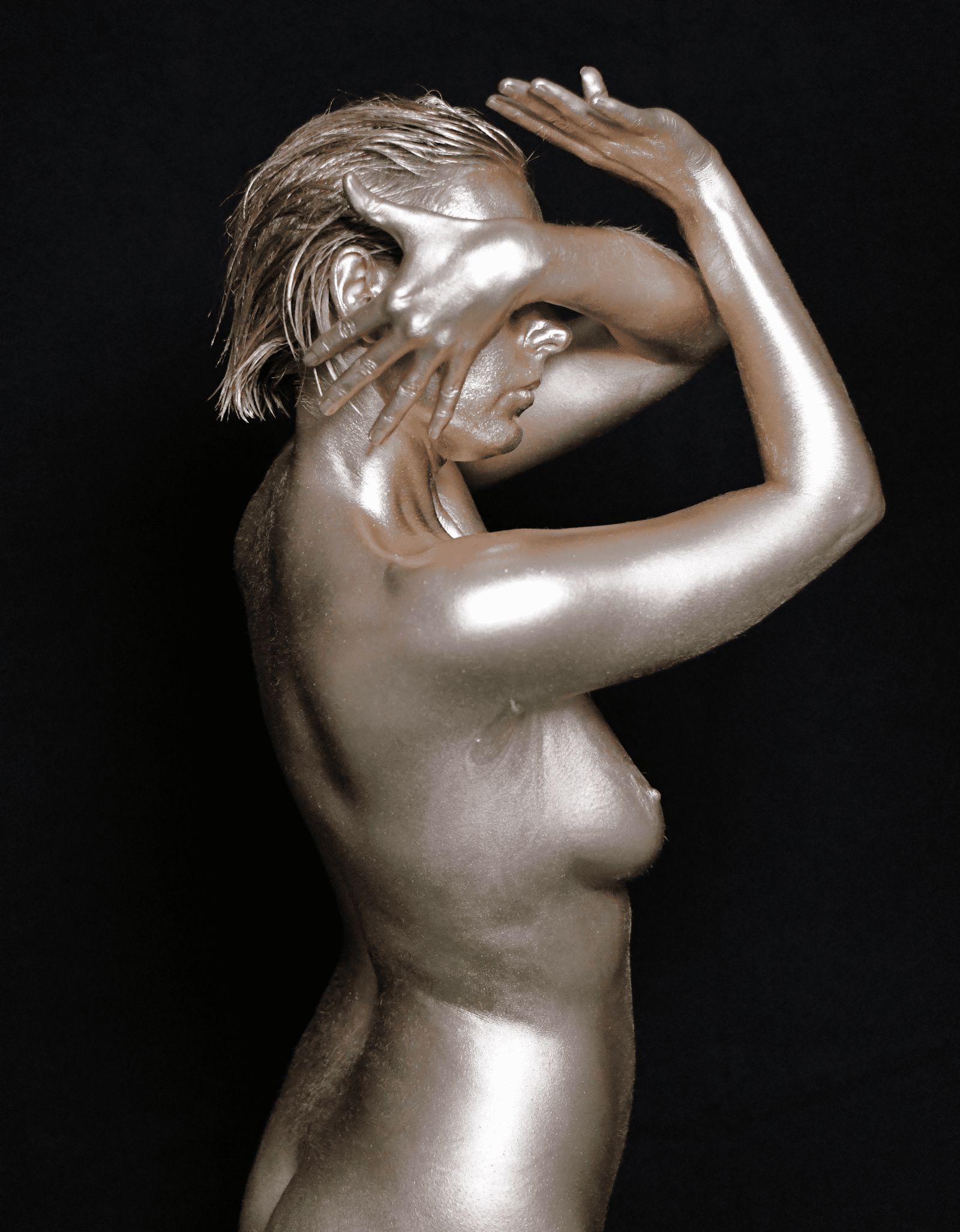 Elegant body art photography featuring a nude model with metallic gold body paint and creative hand placement.