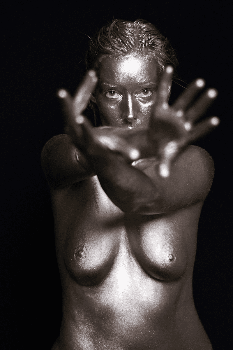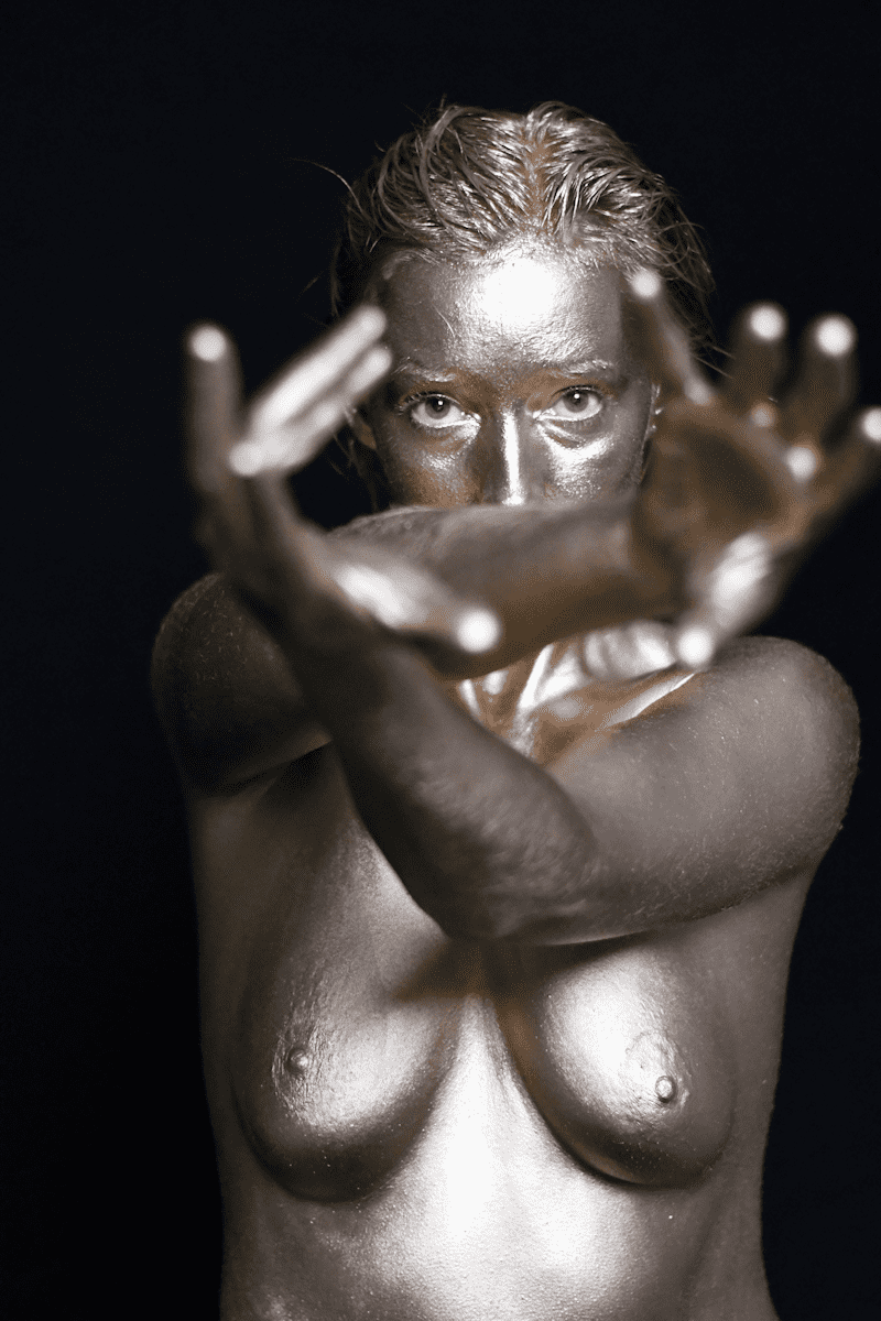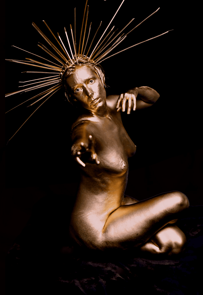 A nude woman painted in gold with outstretched hands on a dark background, capturing artistic body art and modern portrait photography.