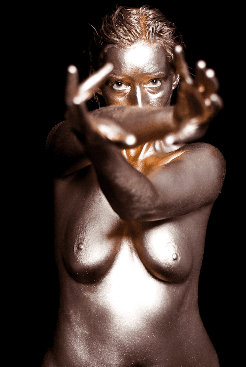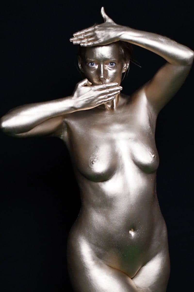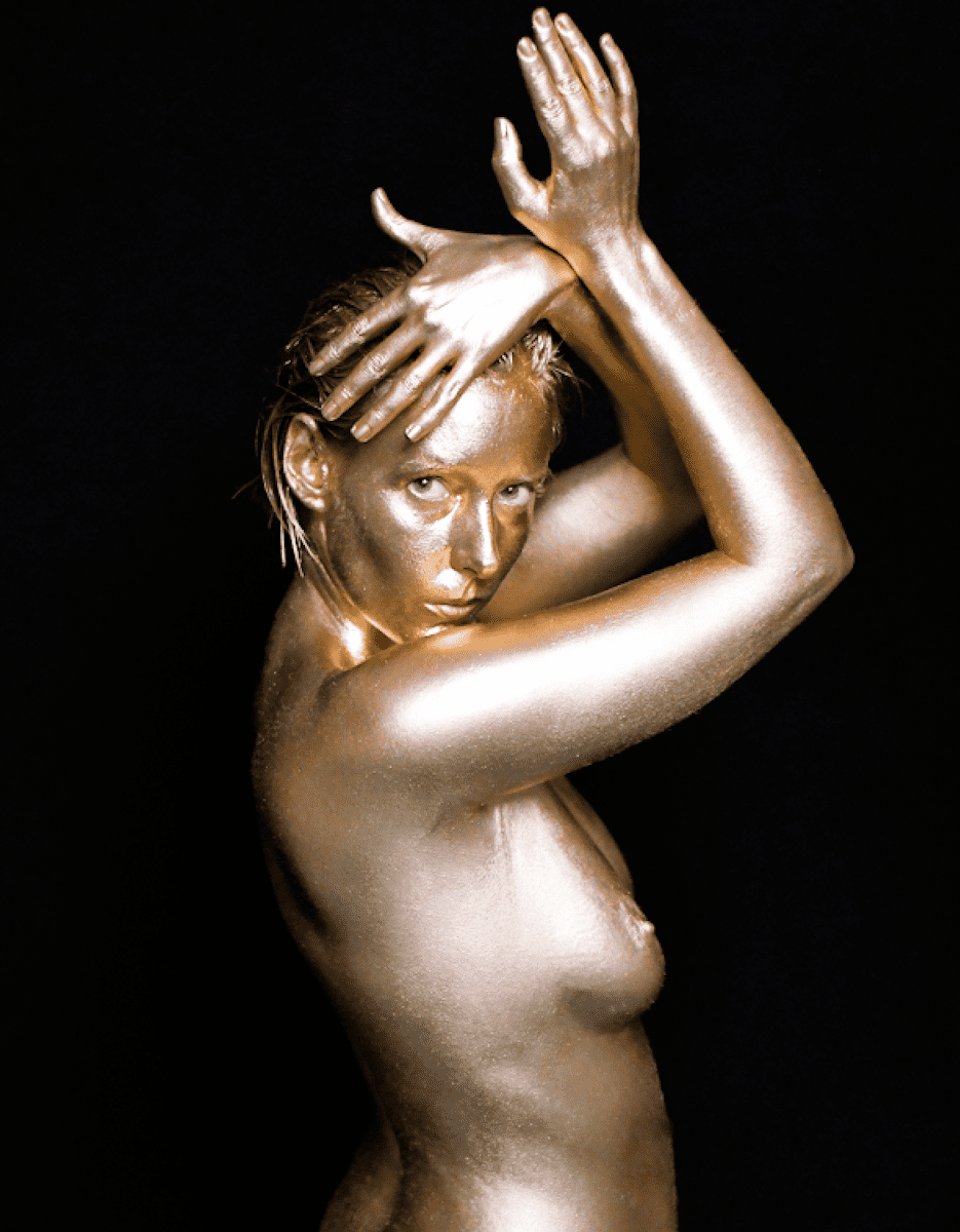 This image features a gold-painted nude woman with outstretched hands against a dark background, showcasing artistic body painting and creative photography techniques.