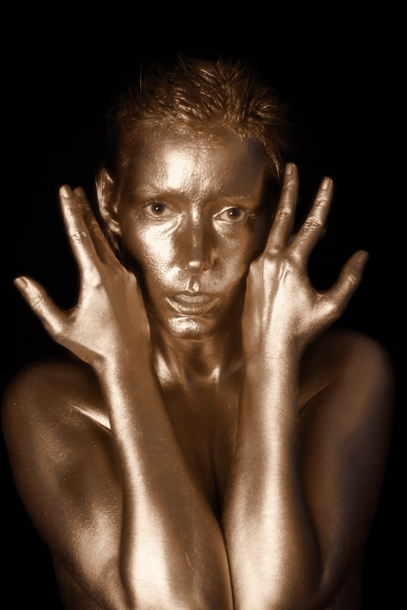 A striking artistic photograph of a nude woman with metallic gold body paint, posing creatively with hands framing her face against black backdrop.