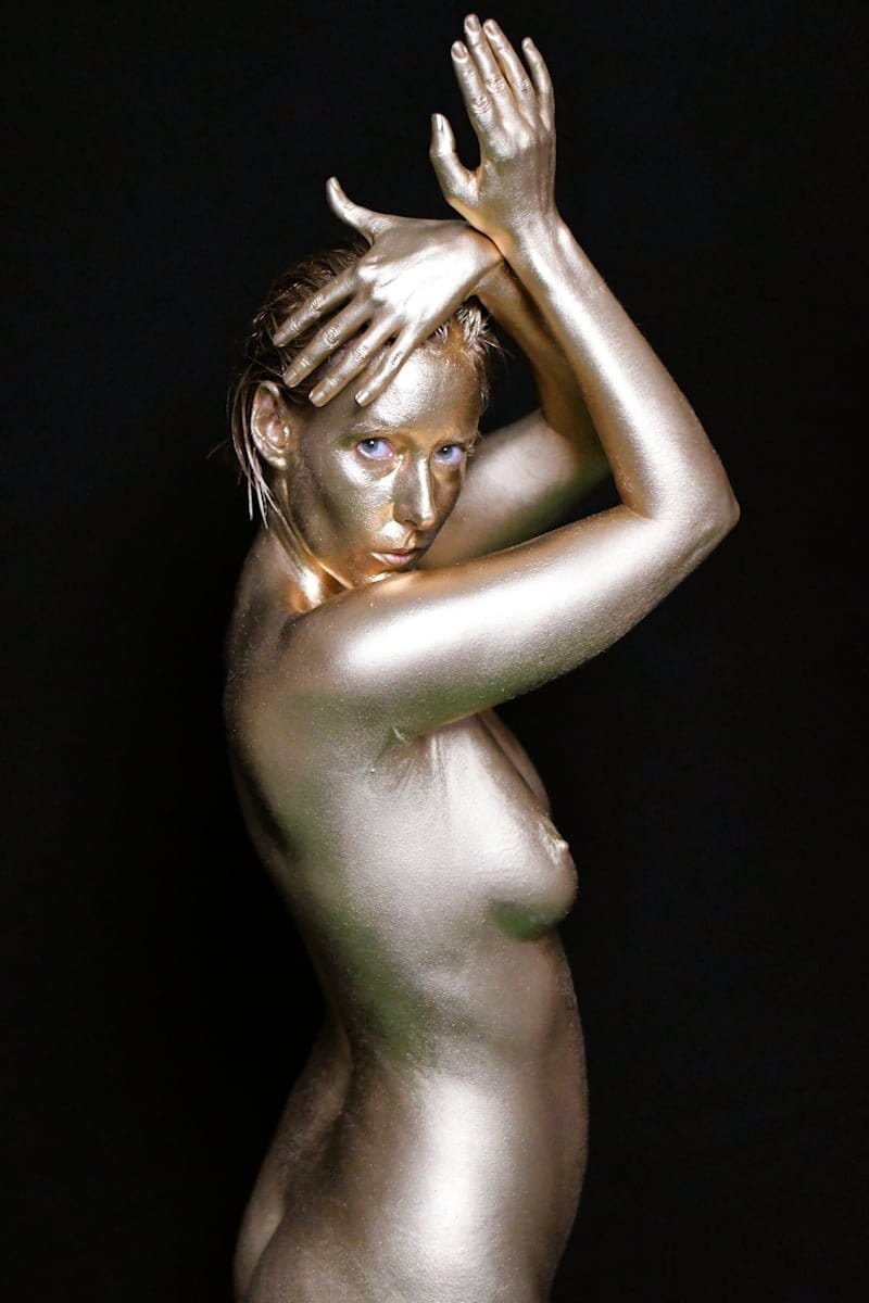 A stunning artistic nude portrait featuring metallic gold body art and expressive pose.