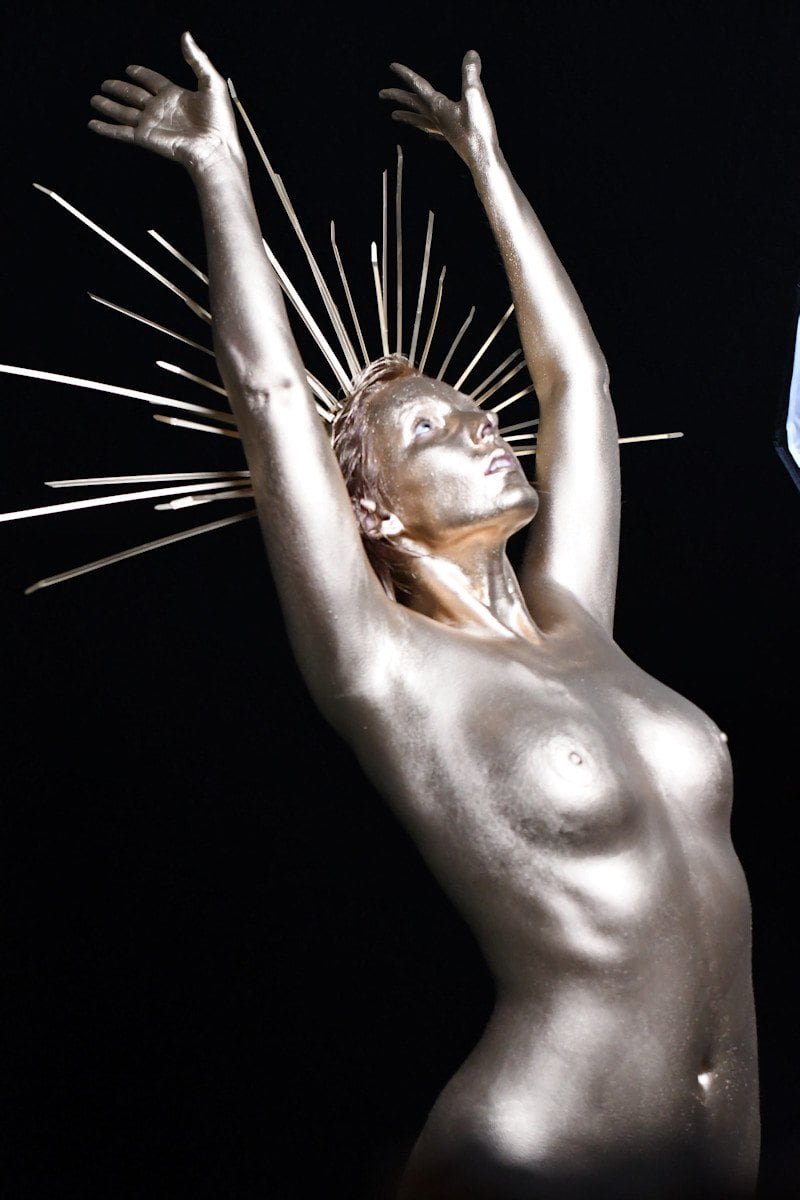 A person with metallic body paint poses against a black background, with hands on hips and an artistic halo of metal rods around their head.