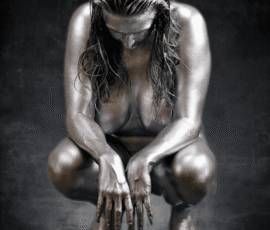 Metallic body paint photo shoot with sword prop, showcasing body art and photography skills.