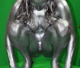 Woman covered in metallic silver body paint, striking pose in front of a green backdrop.