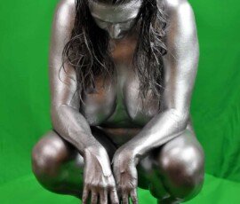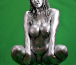 A woman painted in metallic silver body paint poses against a green screen background, showcasing artful body painting and photography skills.