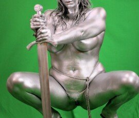 A metallic sculpture of a woman crouching and gripping a sword, with a green studio background, emphasizing artistic body forms and detailed craftsmanship.