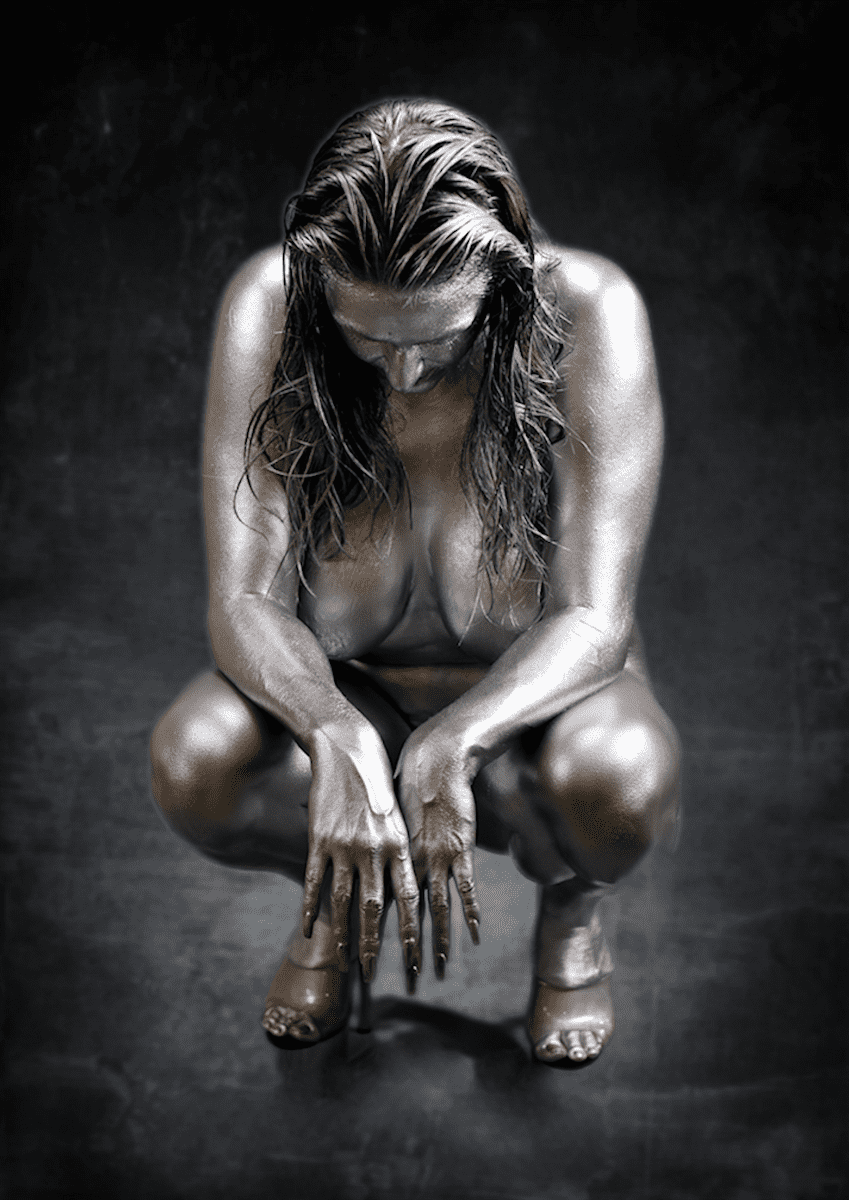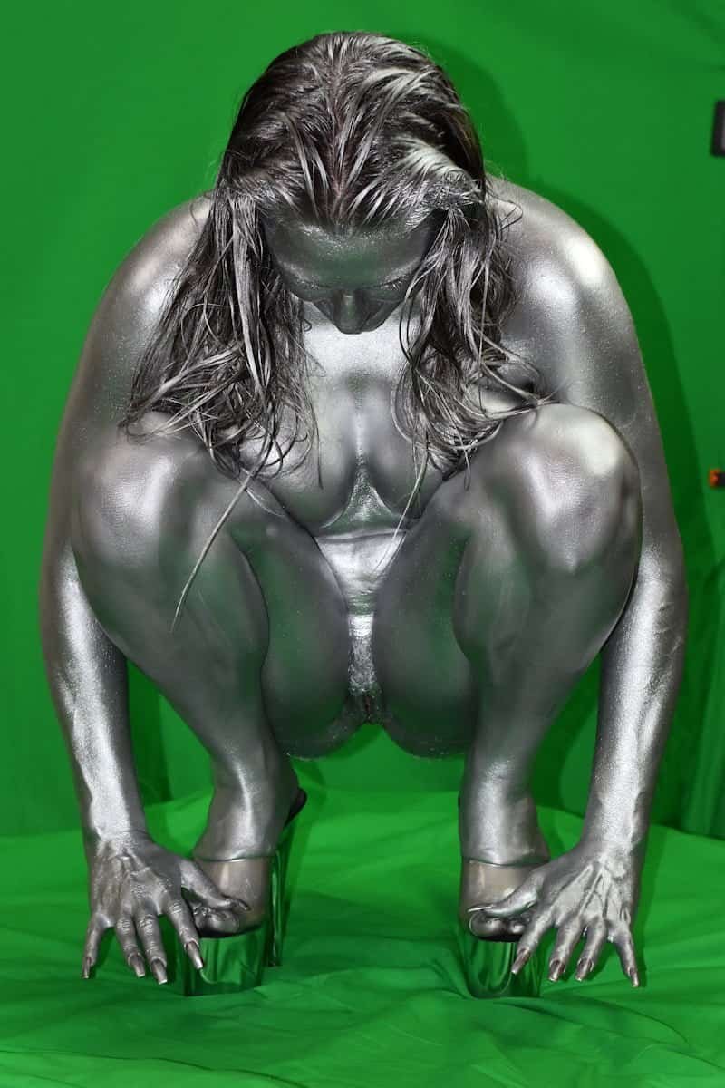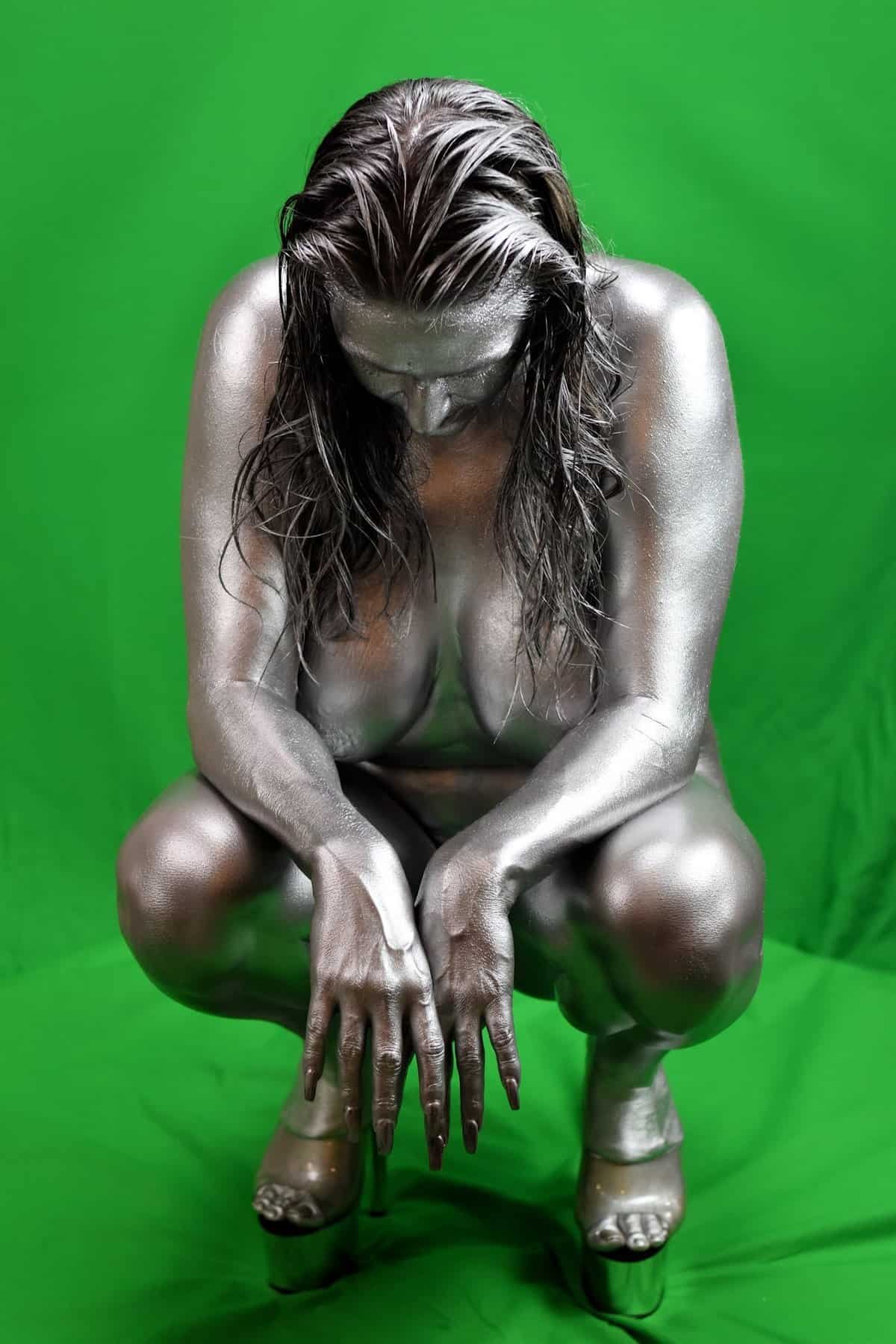 A woman with metallic silver body paint in a crouched pose wearing high heels on a green studio backdrop.