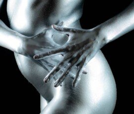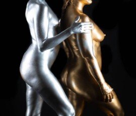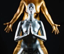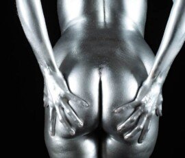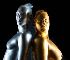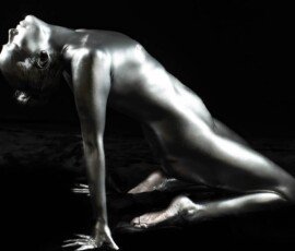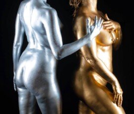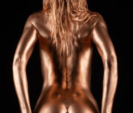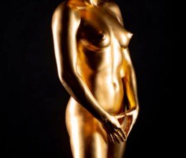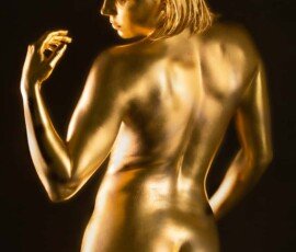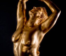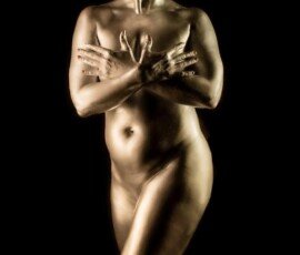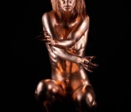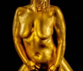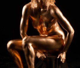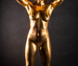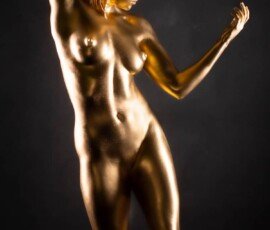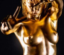 This image features a gold-painted nude woman with outstretched hands against a dark background, showcasing artistic body painting and creative photography techniques.