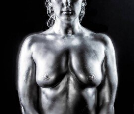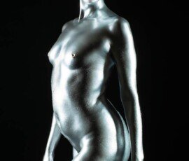 Metallic body paint photo shoot with sword prop, showcasing body art and photography skills.