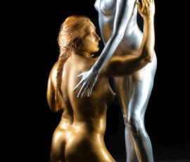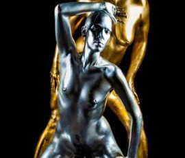 A striking metallic female nude sculpture showcasing elegant form and artistic pose against a black background.