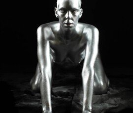 Woman covered in metallic silver body paint, striking pose in front of a green backdrop.