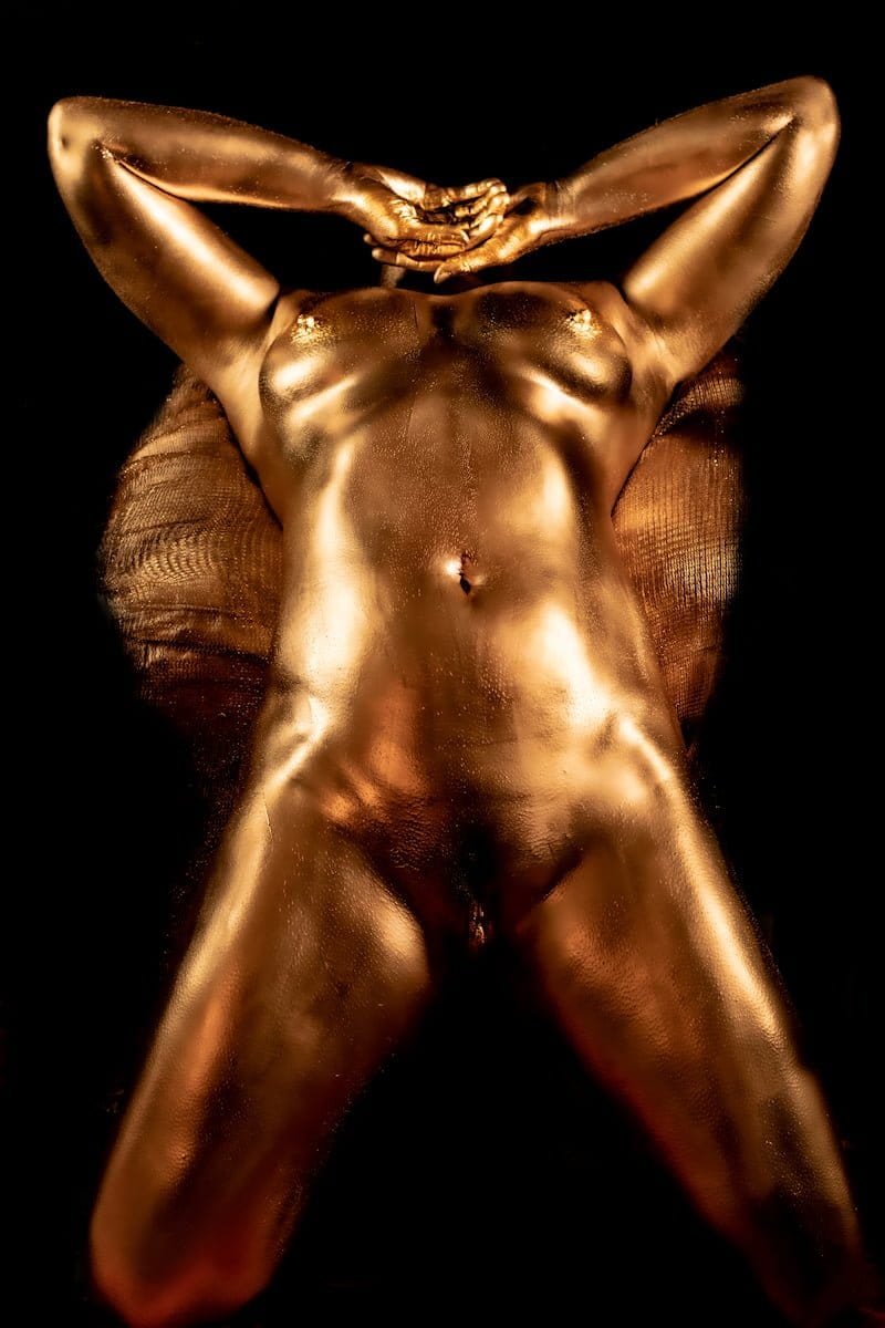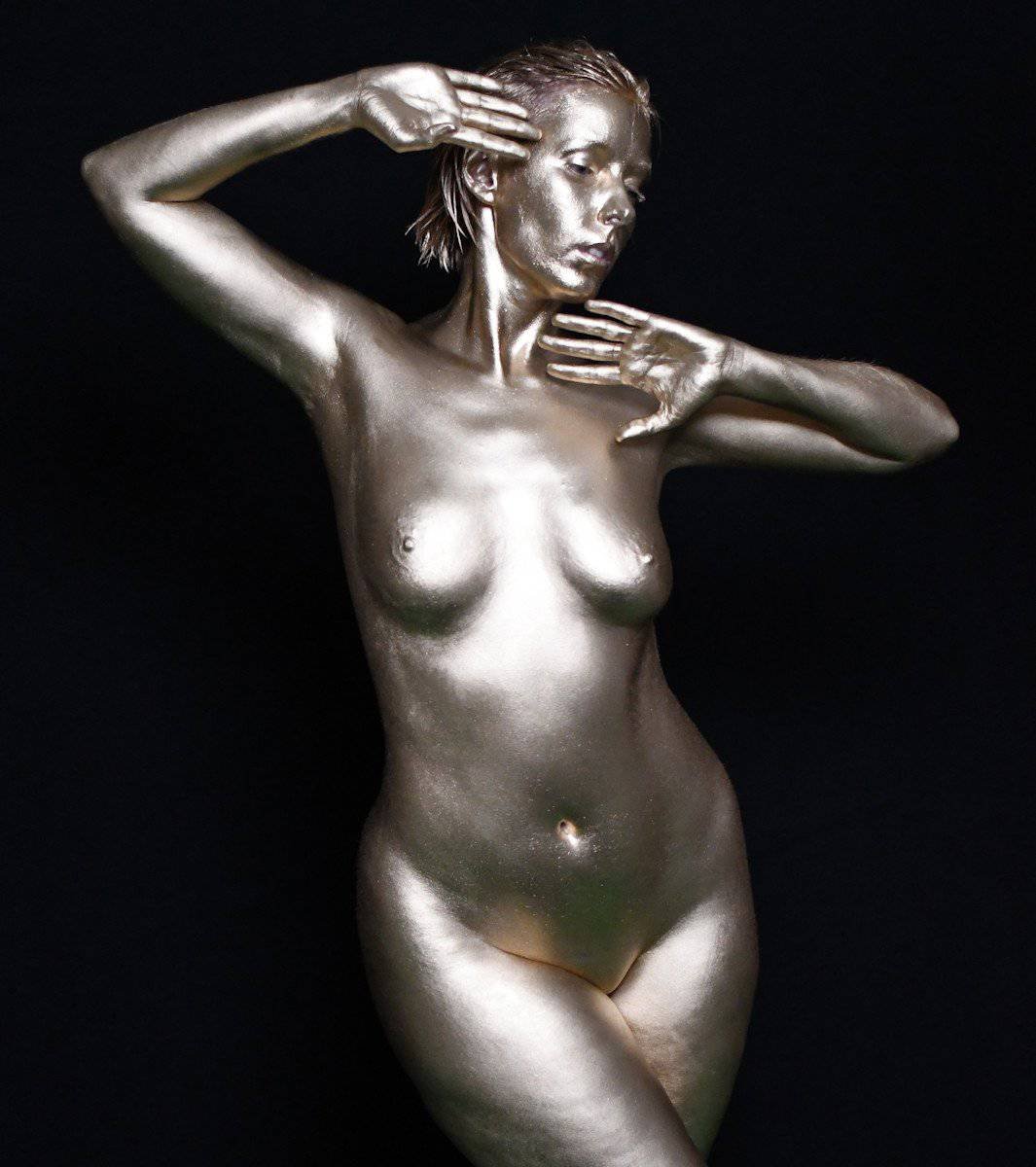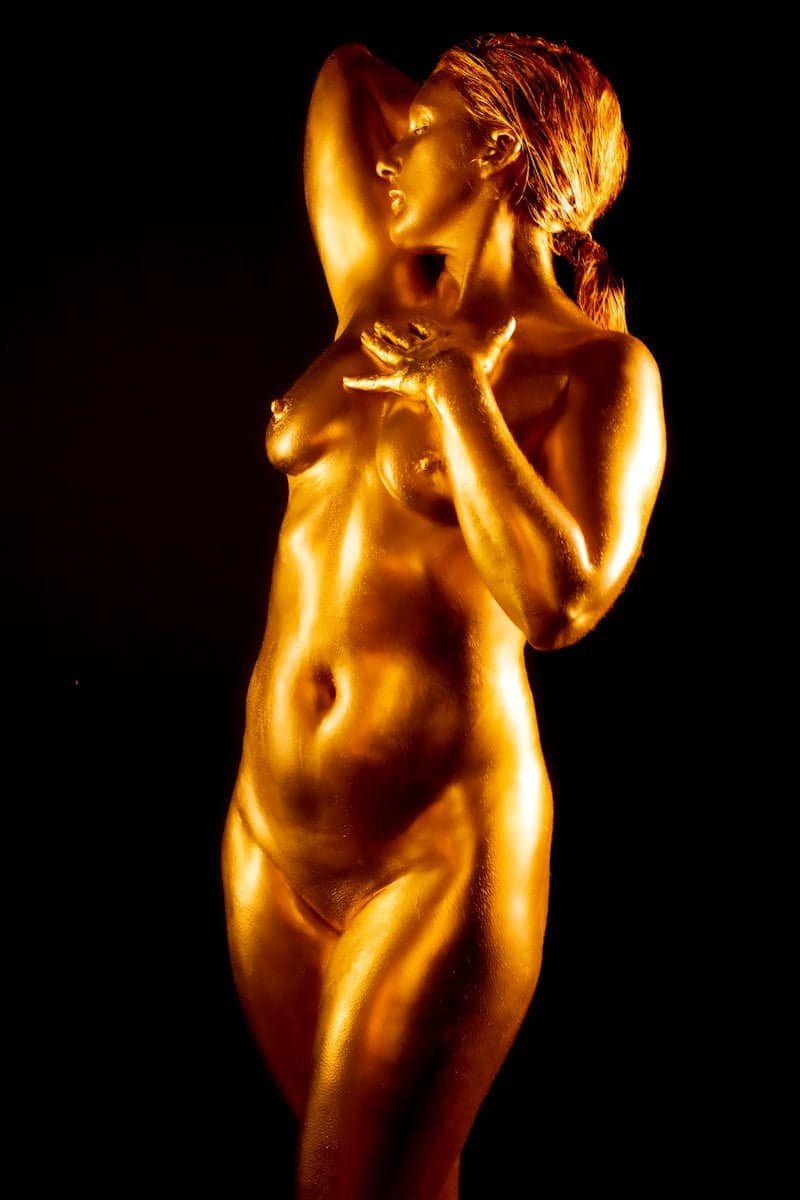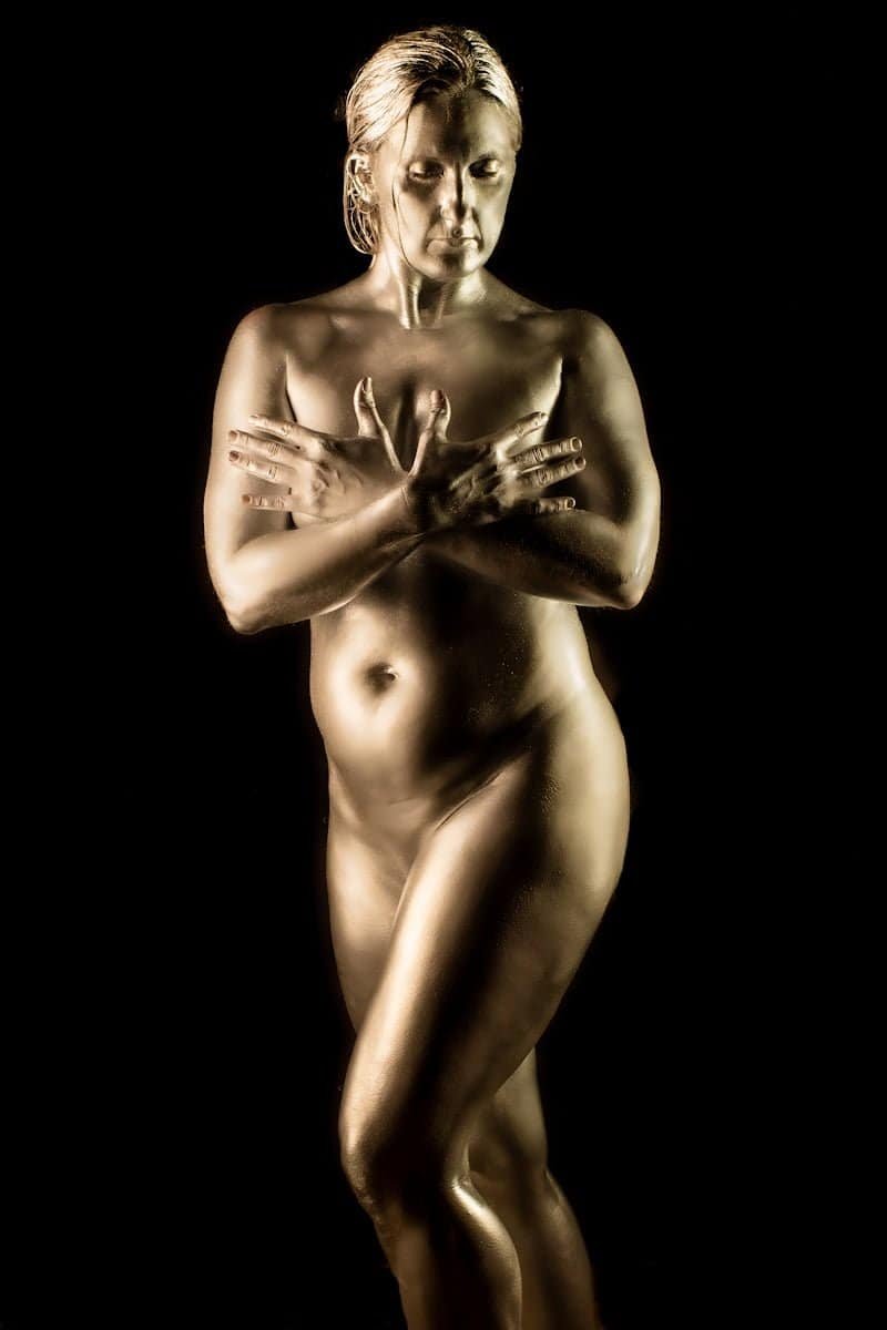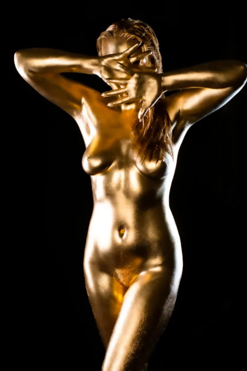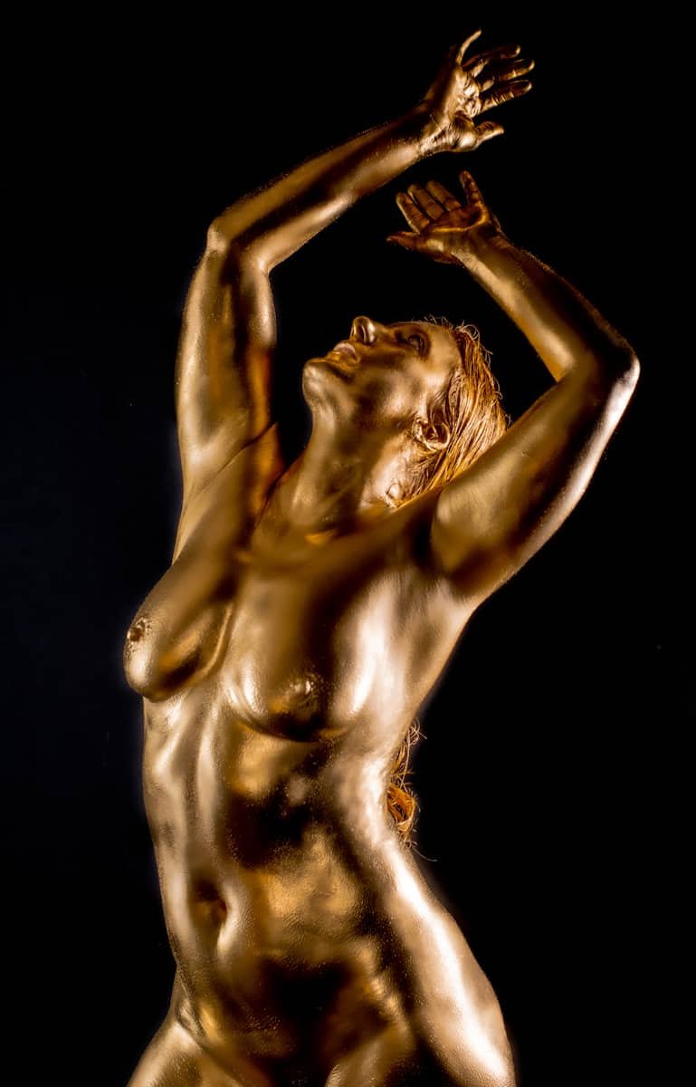 This image features a gold-painted nude woman with outstretched hands against a dark background, showcasing artistic body painting and creative photography techniques.