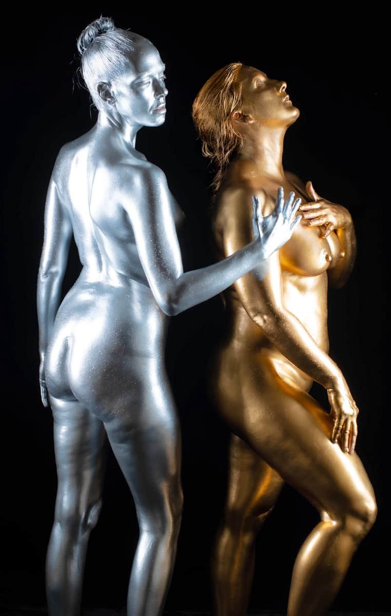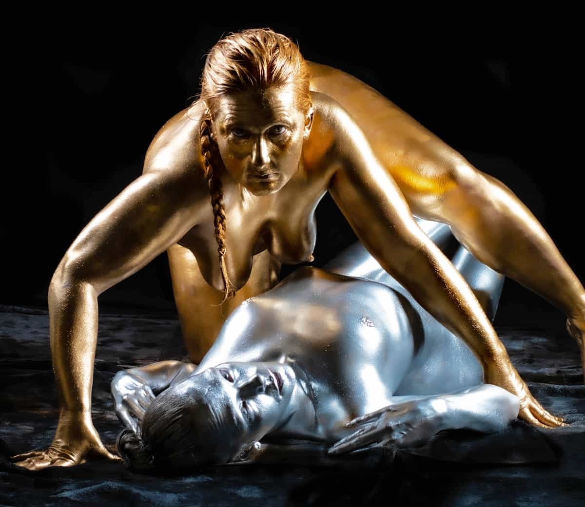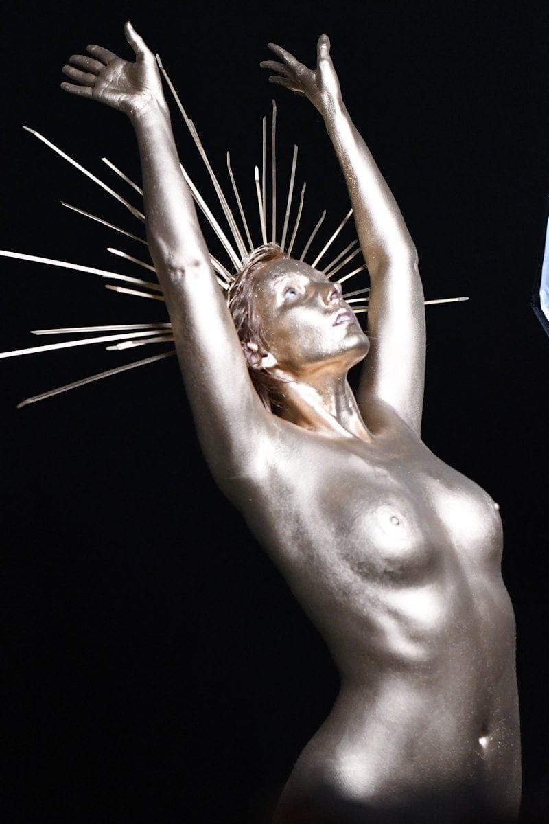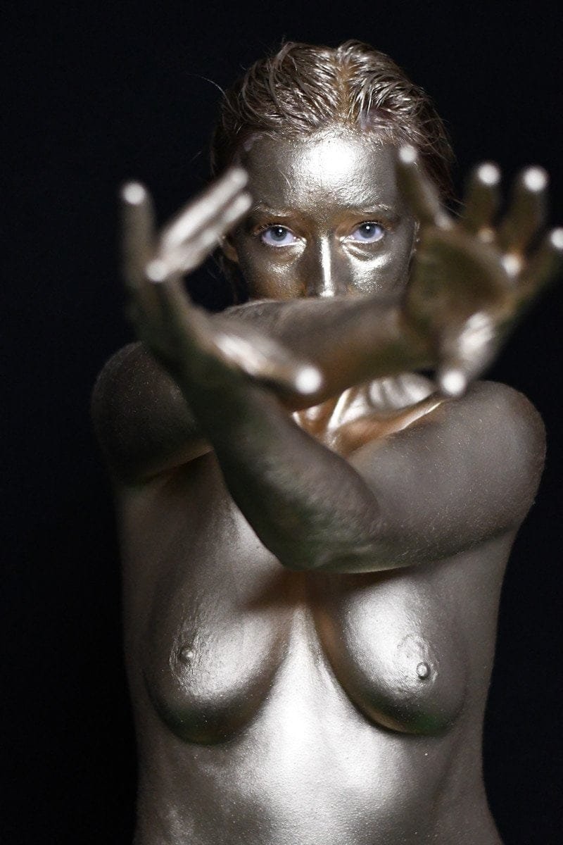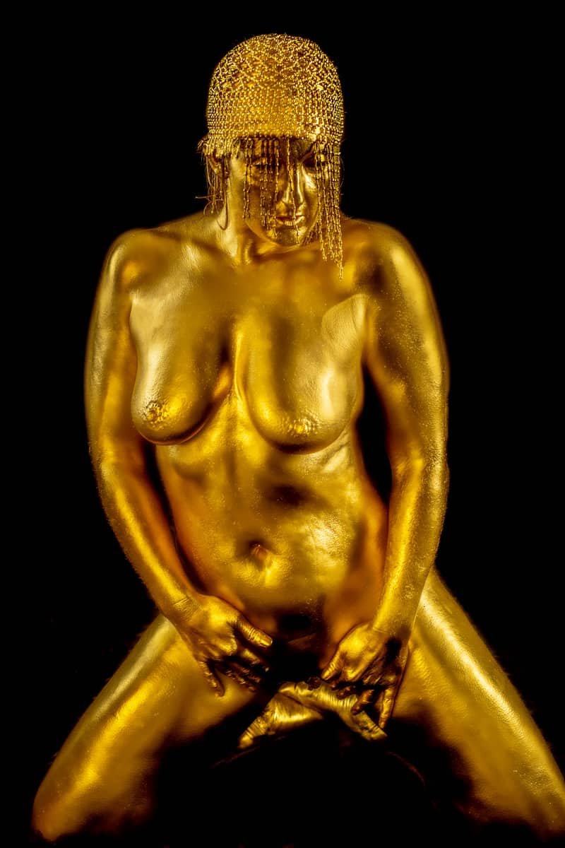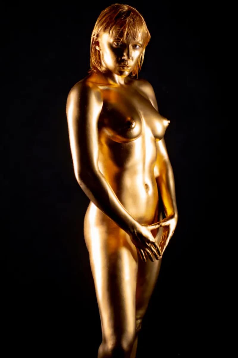 This image features a gold-painted nude woman with outstretched hands against a dark background, showcasing artistic body painting and creative photography techniques.