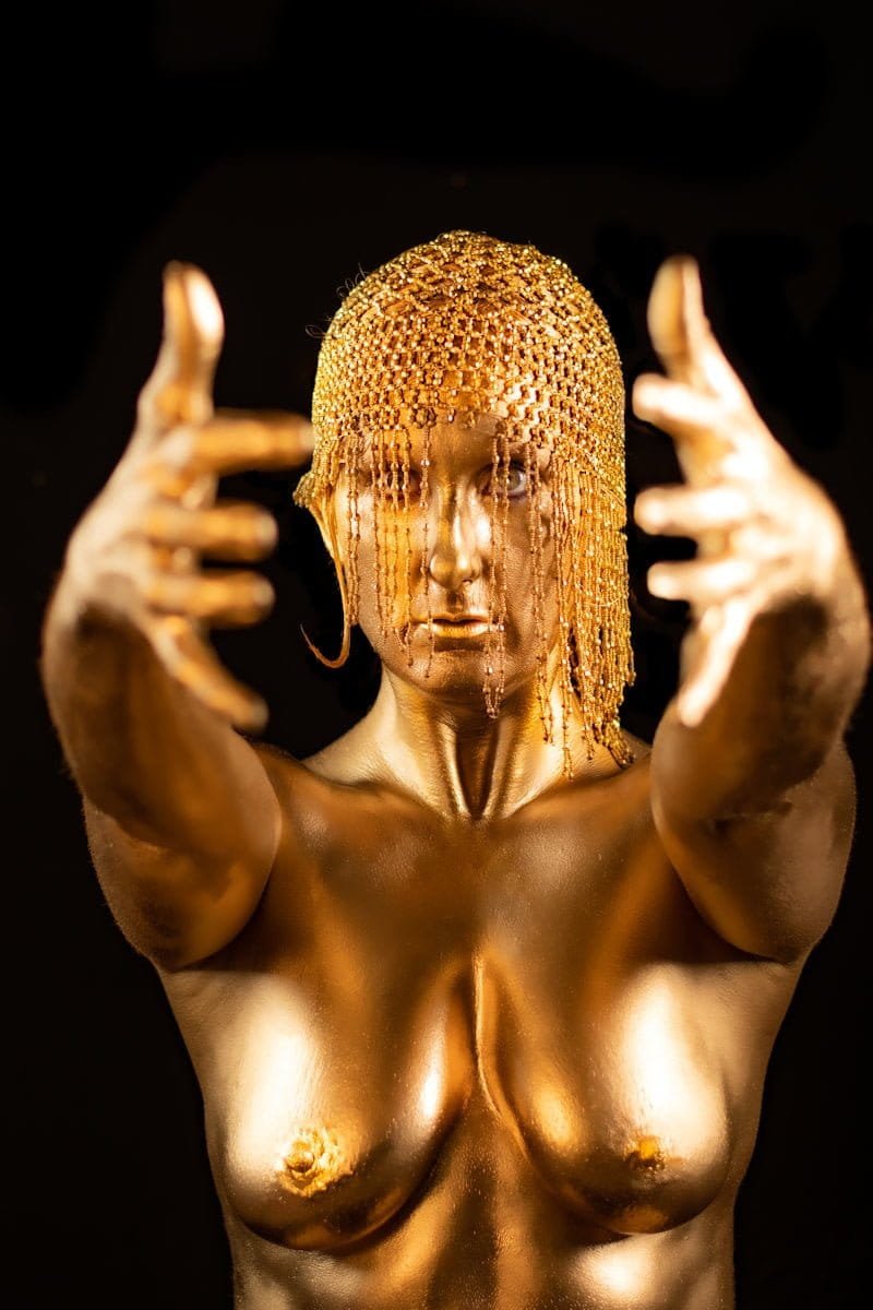 This striking image features a woman with her body and face painted in metallic gold, creating a captivating and artistic visual effect with her reaching hands.
