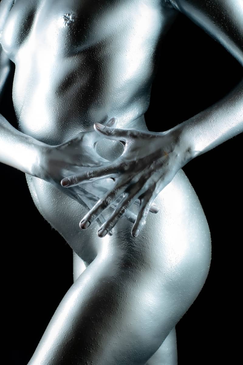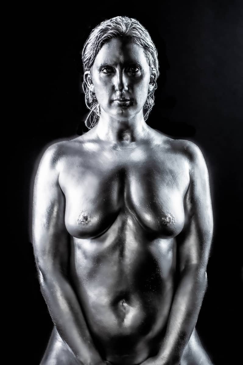 A woman painted in metallic silver body paint poses against a green screen background, showcasing artful body painting and photography skills.