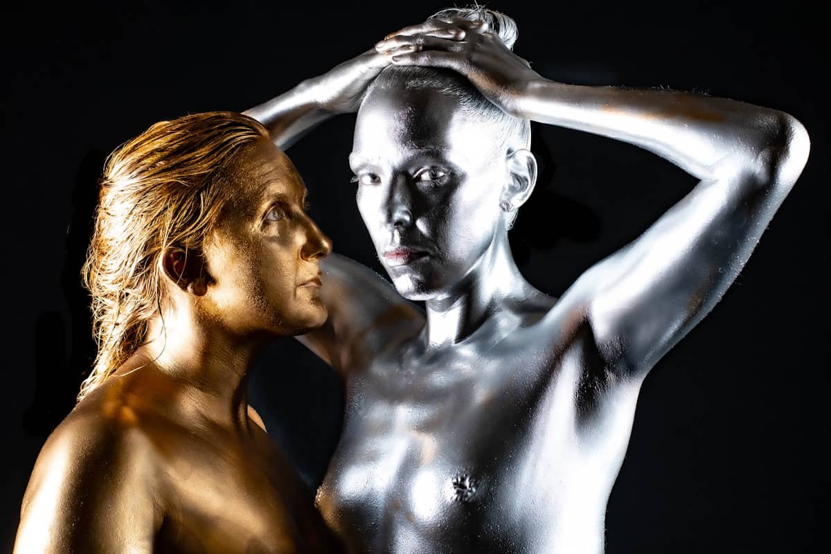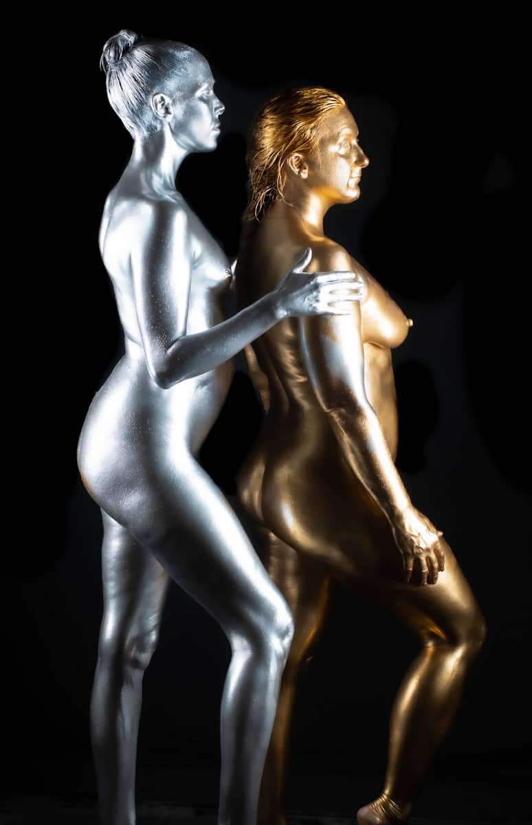 Metallic body paint photo shoot with sword prop, showcasing body art and photography skills.