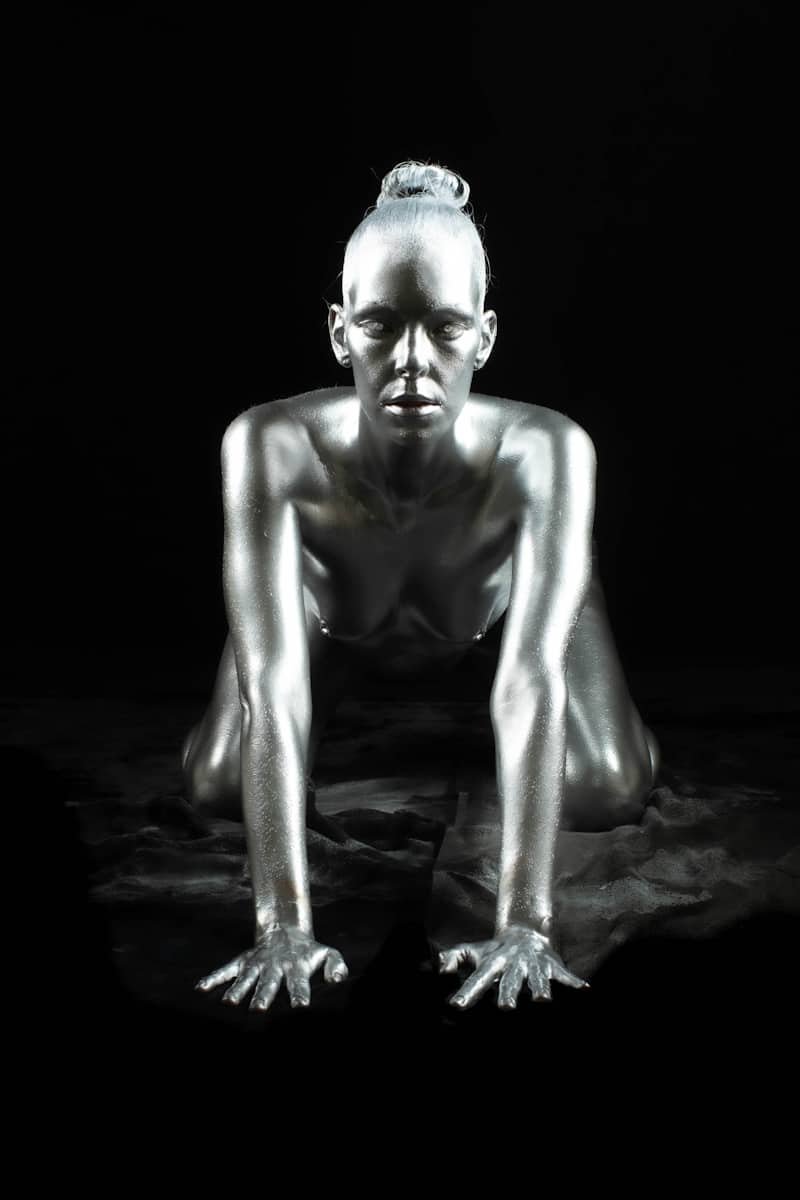 A woman with metallic silver body paint in a crouched pose wearing high heels on a green studio backdrop.
