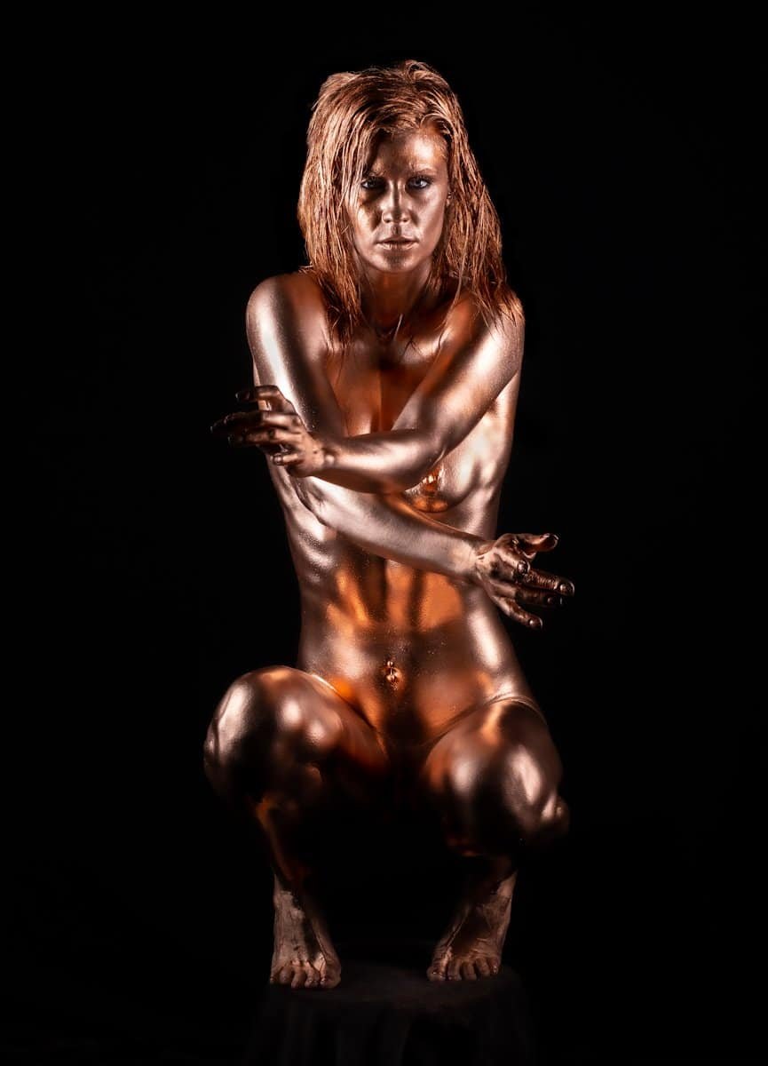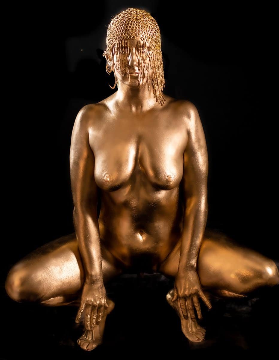 A stunning artistic nude portrait featuring metallic gold body art and expressive pose.