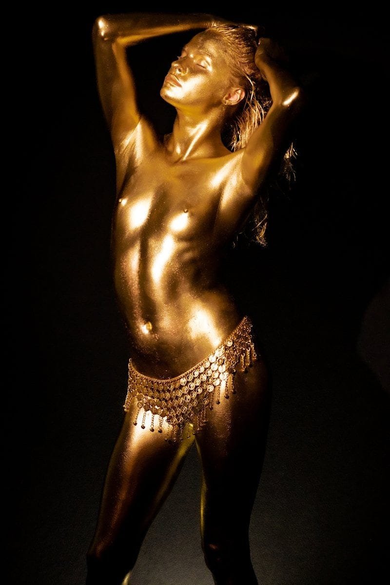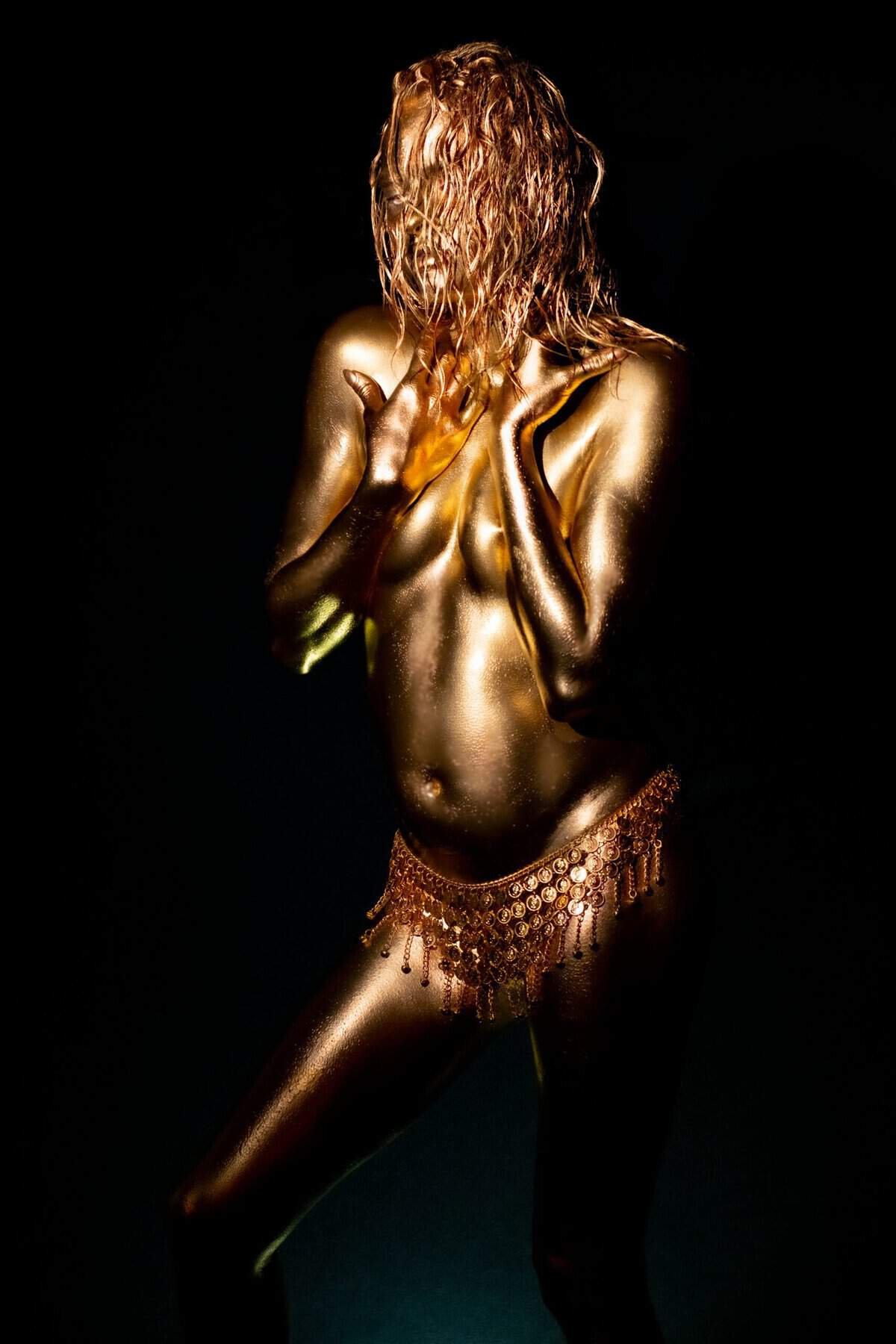 A striking image of a woman covered in gold body paint, wearing a beaded belly chain, under low lighting.