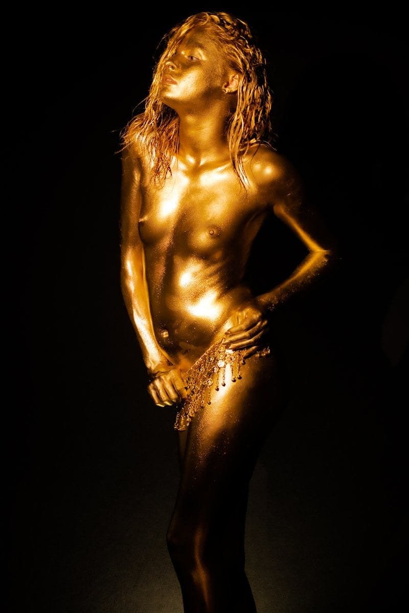 A striking image of a woman with her body painted gold, wearing a coin belt, highlighting luxury and artistic expression.