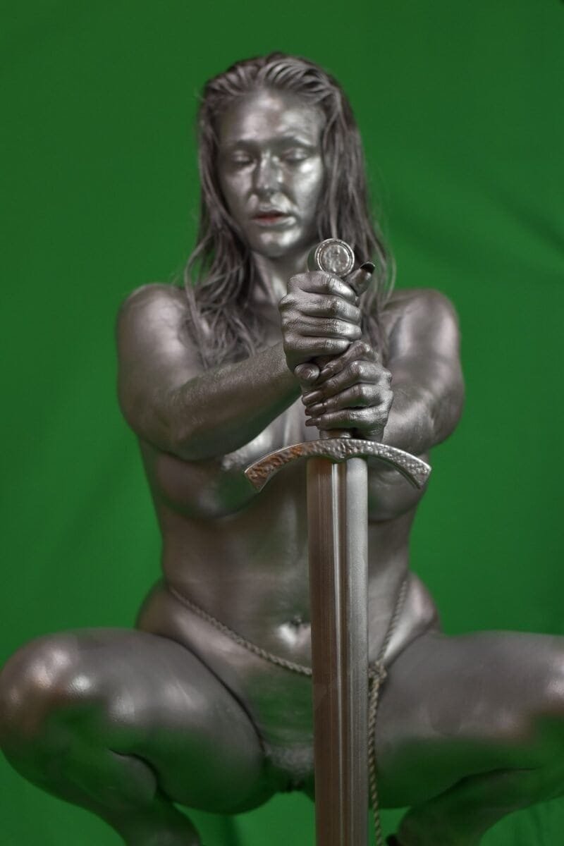 A creative artistic statue of a woman painted in metallic silver, holding a sword in a squatting pose against a green screen background.
