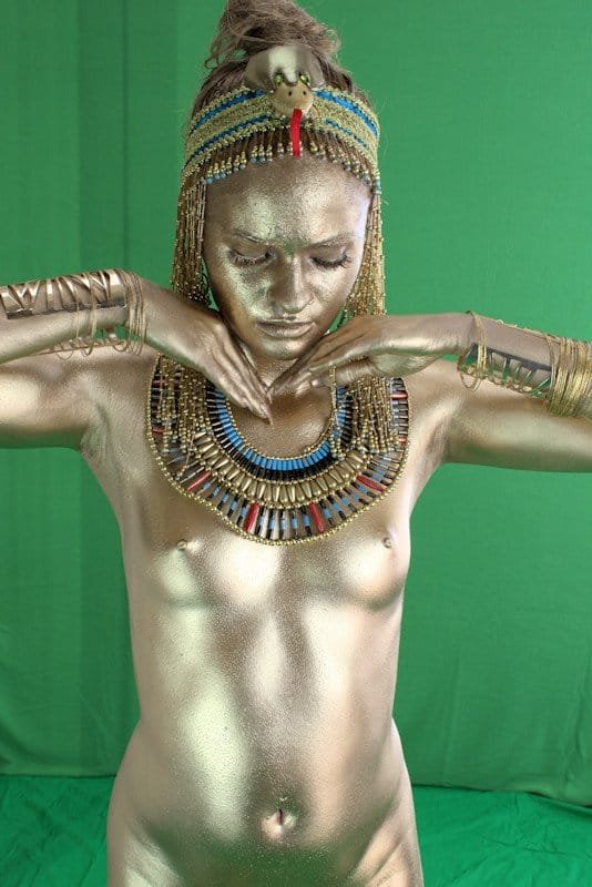 Gold body paint, Egyptian-style jewelry, and headpiece on a female model in front of a green screen background.