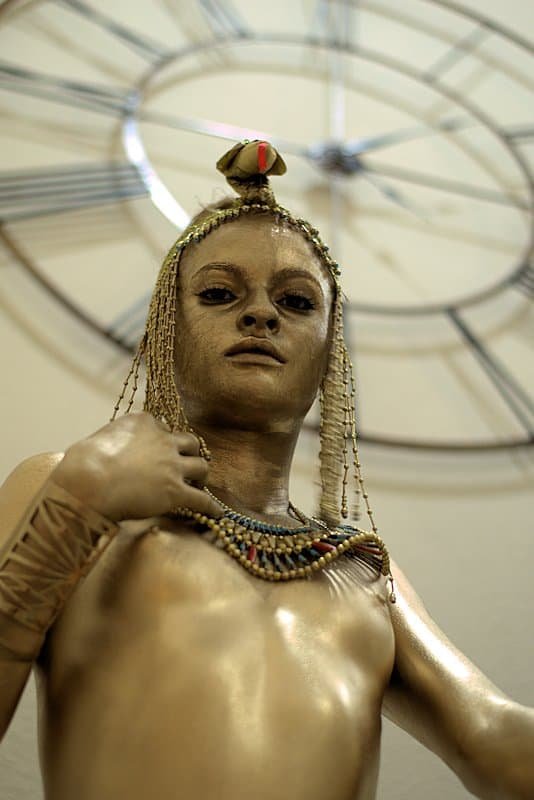 A striking golden statue of a woman adorned with tribal jewelry, standing confidently against a background featuring a large clock.