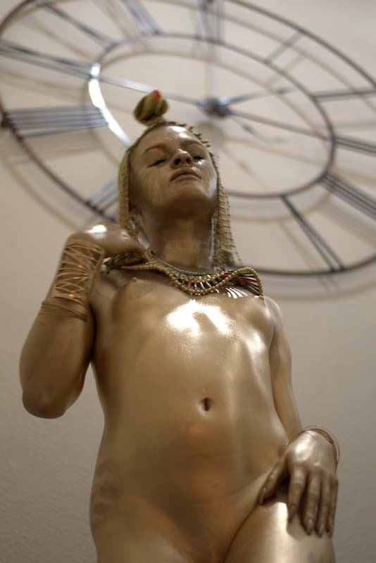 This artwork showcases a detailed golden sculpture of a woman with tribal accessories, set in an indoor environment with a prominent clock behind her.