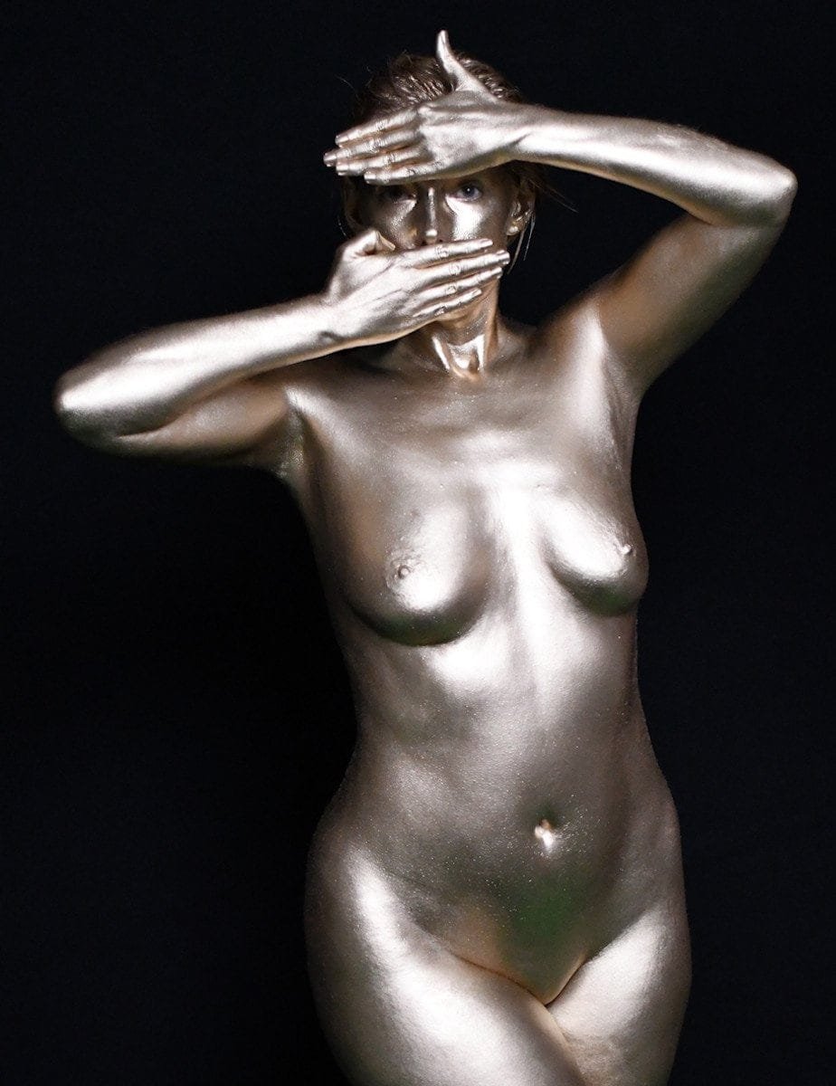 Elegant body art photography featuring a nude model with metallic gold body paint and creative hand placement.