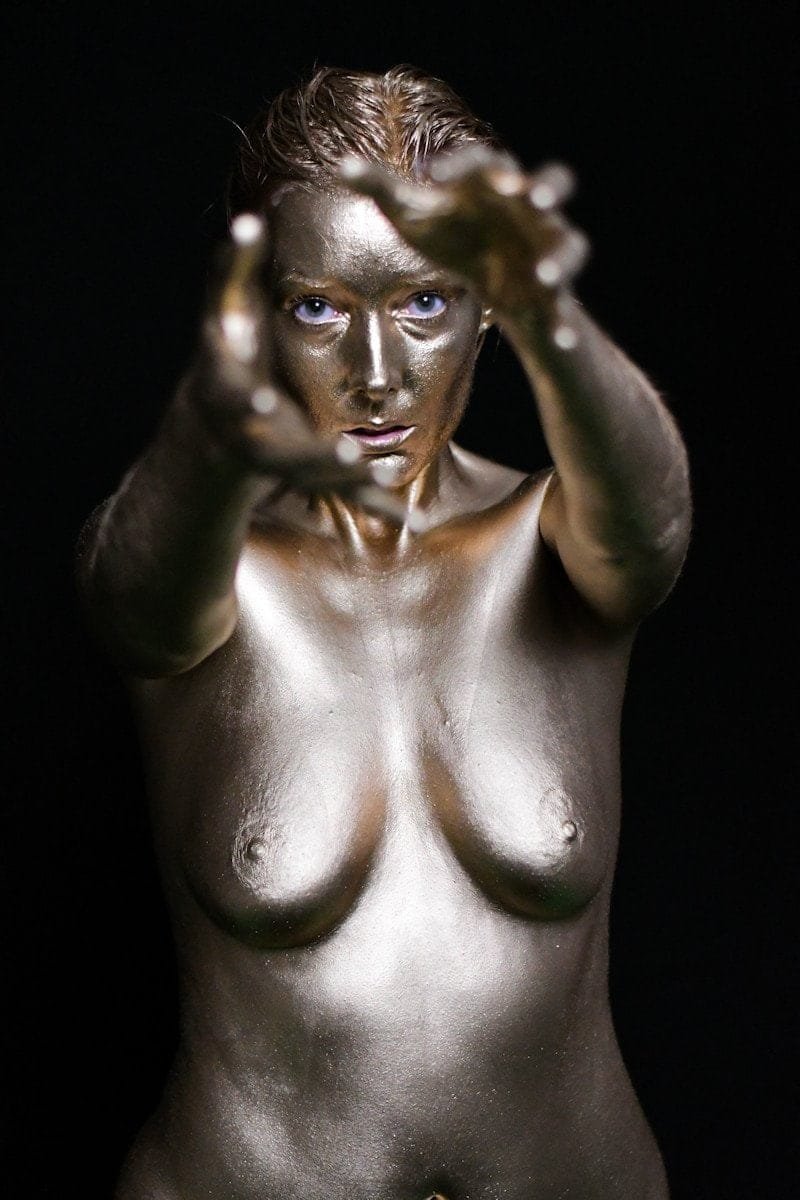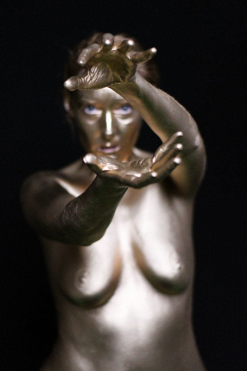 A nude woman painted in gold with outstretched hands on a dark background, capturing artistic body art and modern portrait photography.