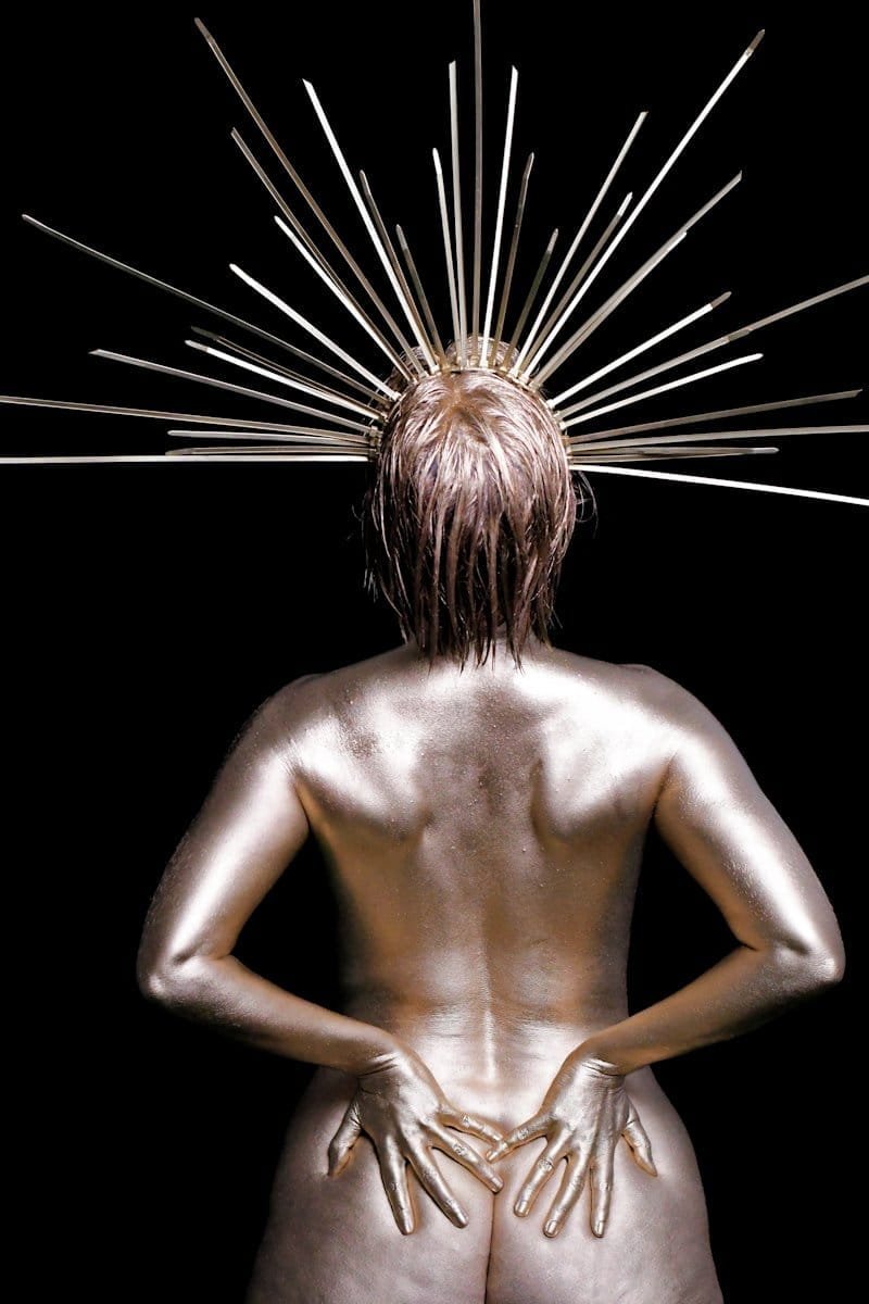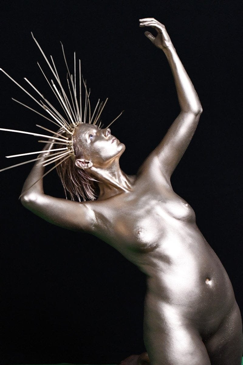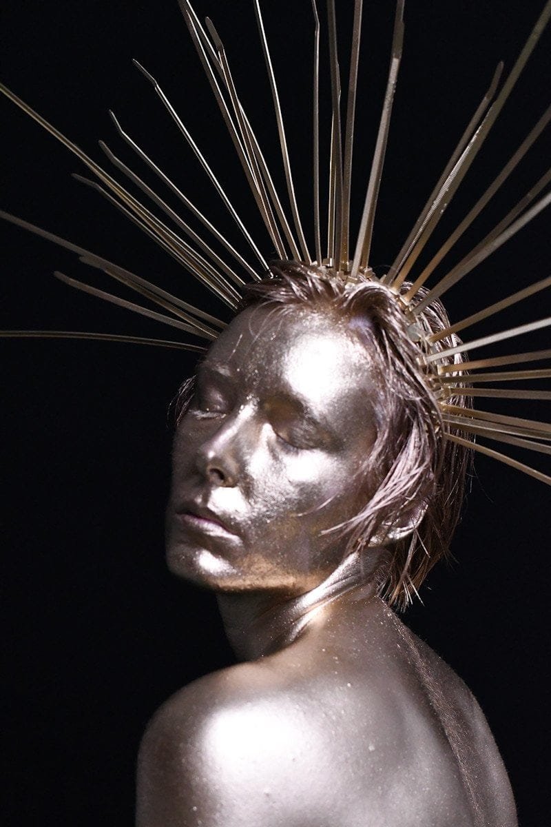 A person with metallic body paint poses against a black background, with hands on hips and an artistic halo of metal rods around their head.